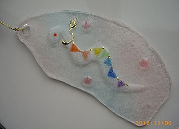 | 干支 吊り飾り 3150円 ○・・・サイズ吊り部分から約32cm ○約16〜17cm ◇・・・サイズ吊り部分から約37cm ◇約18〜19cm ガラス部分 約10×4.5cm (形・絵柄は1点1点手作りですので上記のように微妙に異なります。) 1月の銘々皿 雪うさぎ 新バージョン^^ |