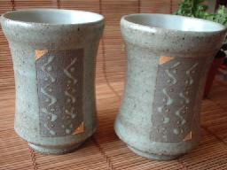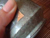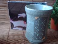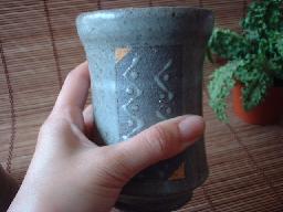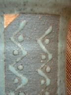 グリーングレーと言いましょうか、そんな地に黒の点が所々にあります。 模様部分はザラザラ・・・全体はツルツルした手触りです。
