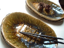 ・HM006 織部大皿 価格5000円(税込・送料別) サイズ 29*21.5センチ*高さ2.5〜4センチ 織部小鉢と同じ色合いの、それはそれは大胆な土味がたっぷと味わえる豪快な器です。 |