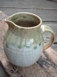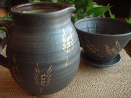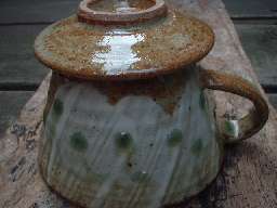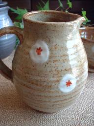 サイズ ポット13.5(持ち手含む)×高さ13.5 灰釉の釉溜まりが水玉のように |