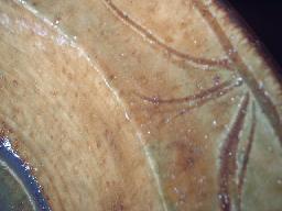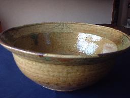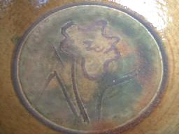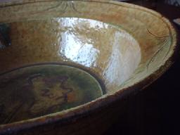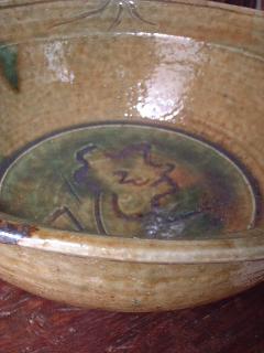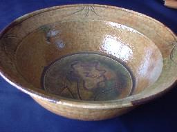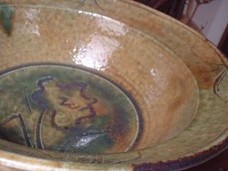 ![]() 見込み部分は織部釉の緑色が印象的で、 平べったい部分が多いので、かなり たっぷり盛れそうです。 |