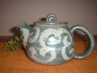 青みの強い緑色です。持ち手も大きくて持ちやすいです。インテリアにもイイ・・・かわいいポットです。