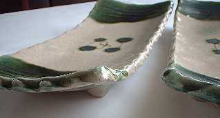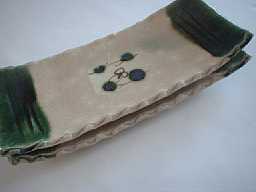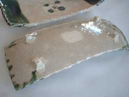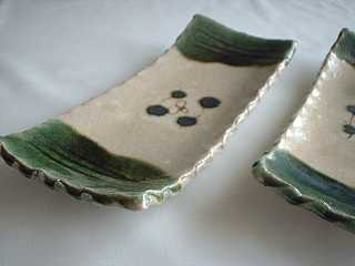 ![]() 4つ足の付いた長角皿です。 織部釉の掛かっている部分には削りが3本、、、 縁部分にもたっぷりの手仕事が感じられます。 長さを全て生かしても。。。また、真中部分だけで 長さをパセリ感覚?で使った使い方も。。。(^^) |