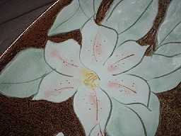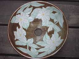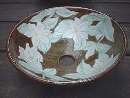 赤土に彫りで花が描かれ白の化粧土で装飾されています。