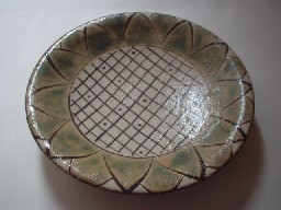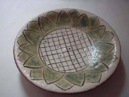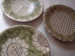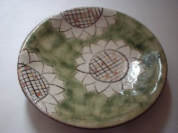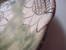 縁までいっぱいにひまわりが描かれています。手触りはざらざら。縁部分は地の色、茶がでています。