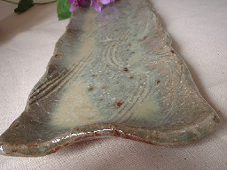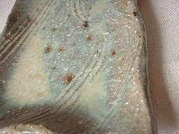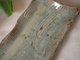 表面には櫛目が施され、その窪みには緑掛かった水色の釉薬が溜まっています。